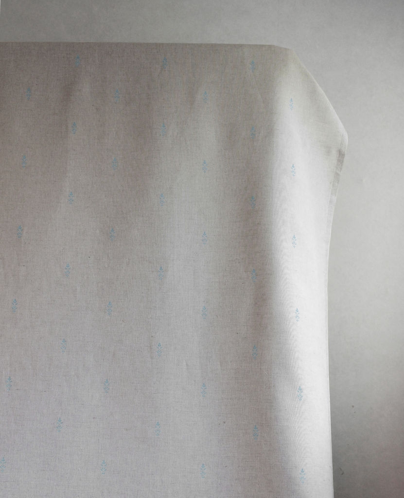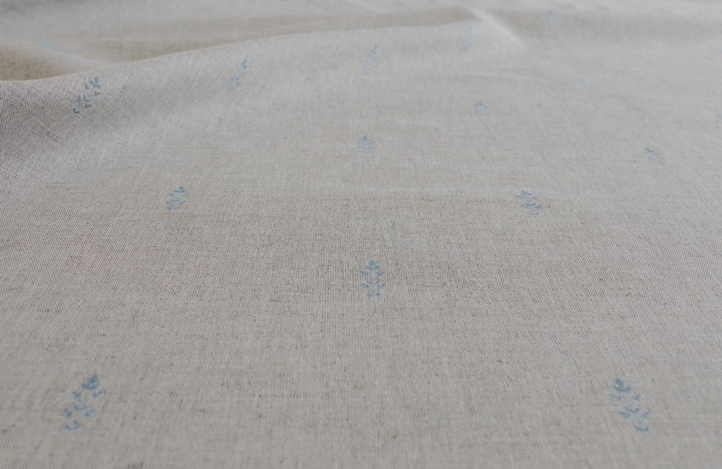 Asli Duck Egg is a Natural Linen Cotton fabric with a classical blue pattern. Medium weight fabric.