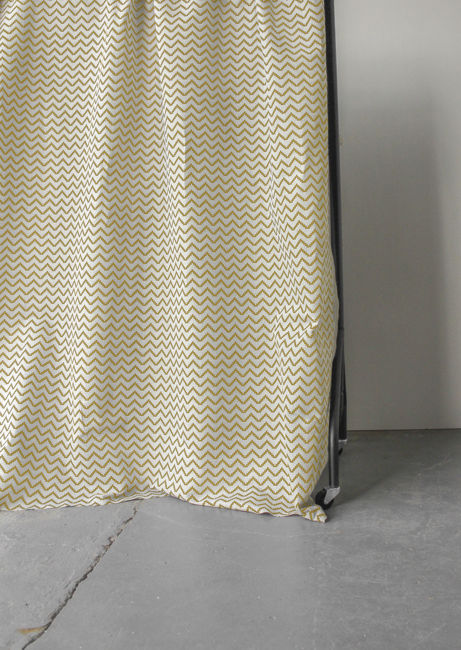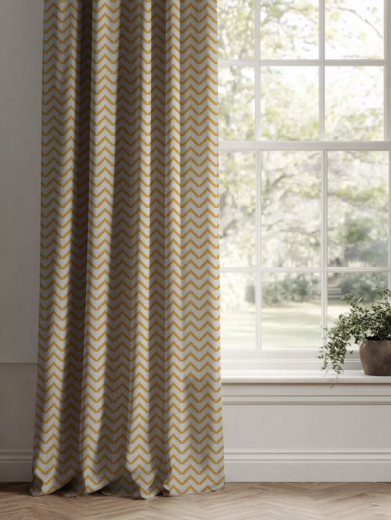 Natural Linen Fabric printed with Mustard Yellow, bold zig-zag pattern for modern interiors! Medium weight fabric.