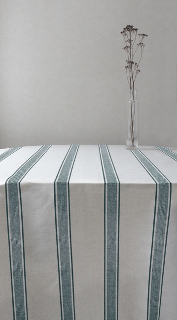 Natural Linen Fabric printed with Green stripes. Medium weight fabric.