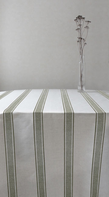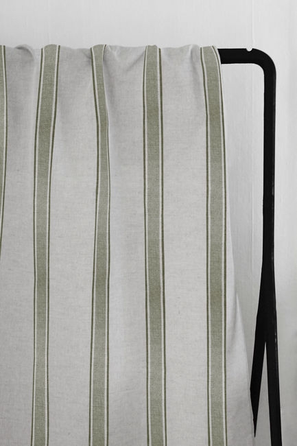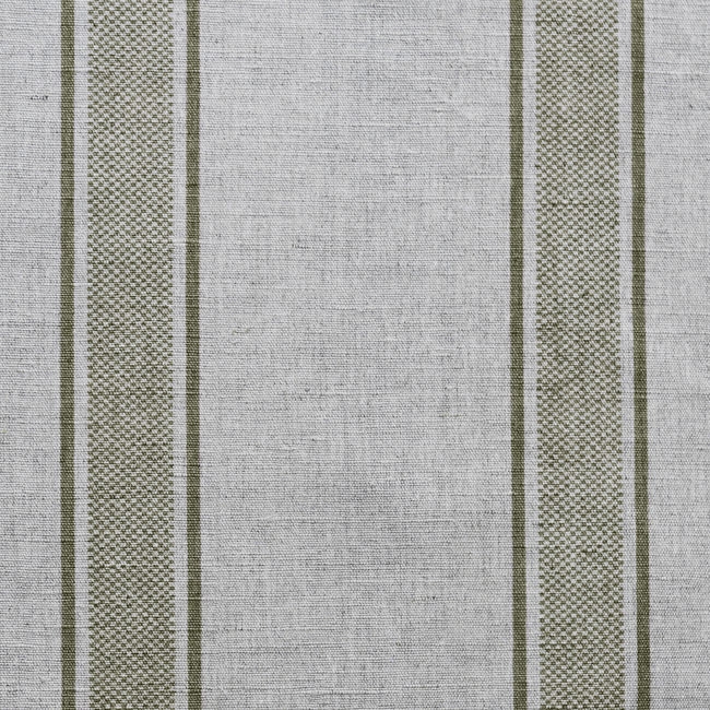 Natural Linen Fabric printed with Olive Green stripes. Medium weight fabric.