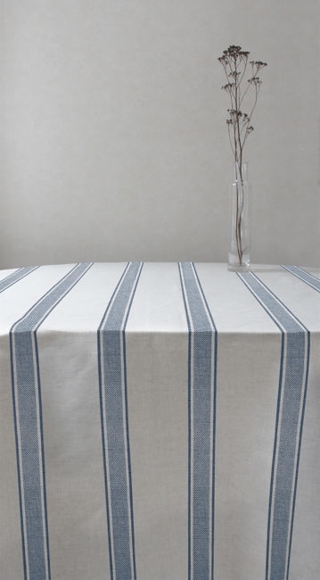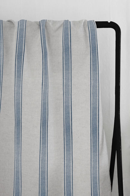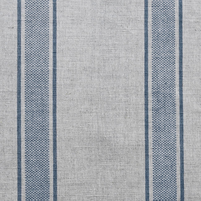 Natural Linen Fabric printed with Blue stripes. Medium weight fabric.