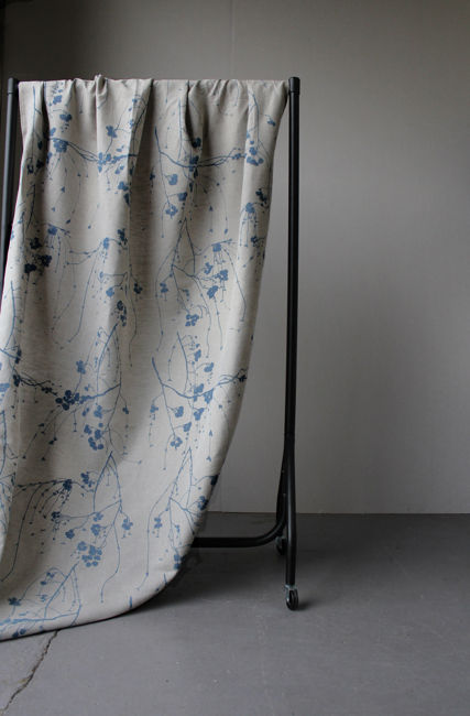 Natural Linen Fabric printed with Blue botanical print. Medium weight fabric.
