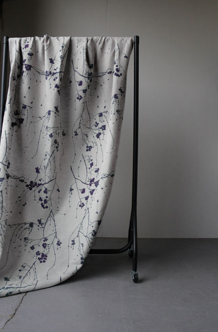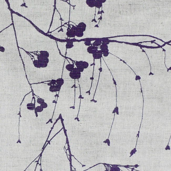 Natural Linen Fabric printed with Purple botanical print. Medium weight fabric.