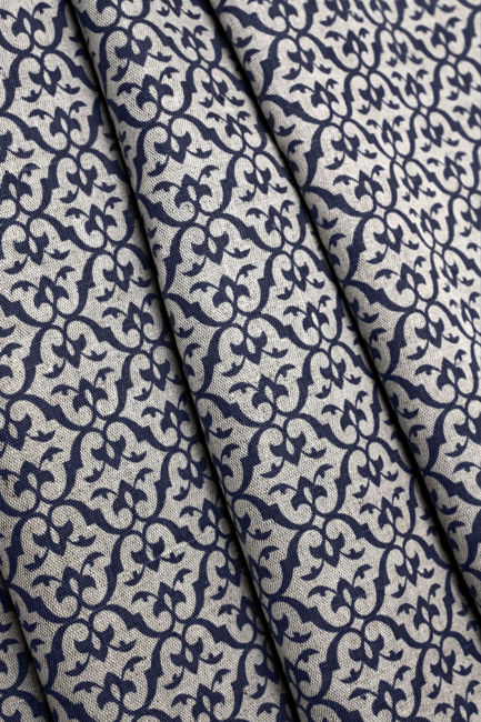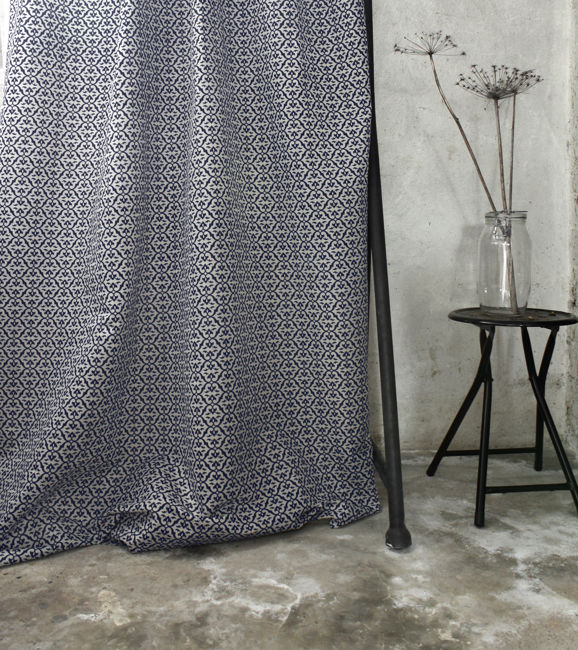 Brita Deep Blue is a Natural Linen Cotton fabric with Dark Blue print. Medium weight fabric.