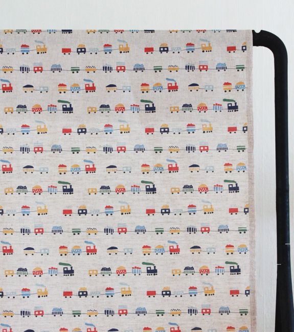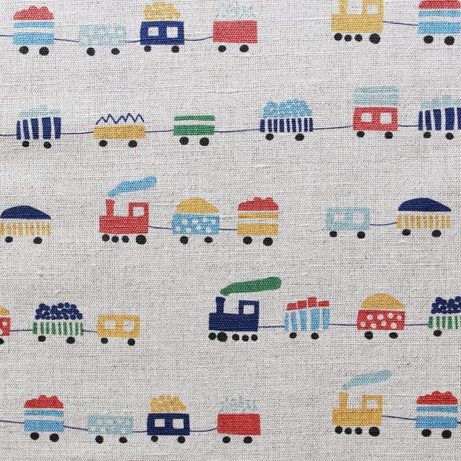 Bruno Navy is a Natural coloured linen cotton fabric with a cheerful train pattern. Medium weight fabric.
