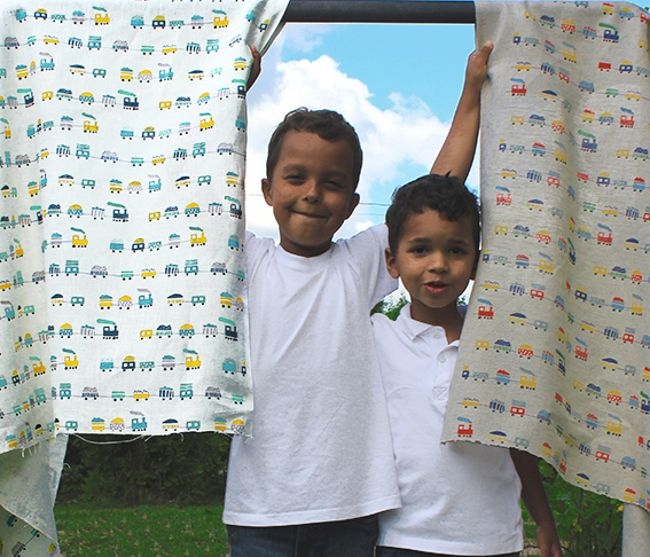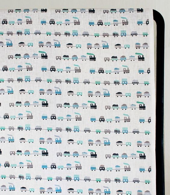 Bruno Sky-WHT is a white linen fabric with a cheerful train pattern. Medium weight fabric.