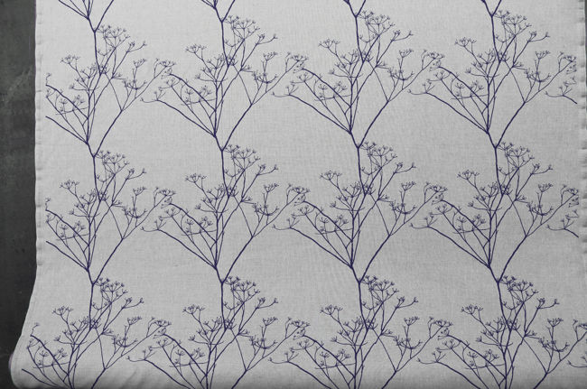 Natural Linen Fabric printed with Blue floral print. Medium weight fabric.