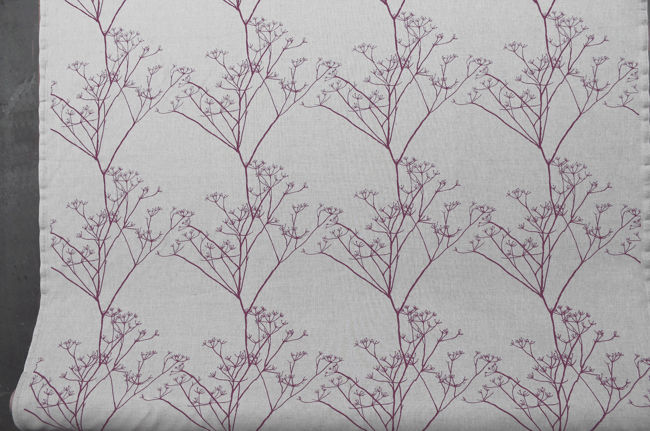 Natural Linen Fabric printed with Purple floral print. Medium weight fabric.
