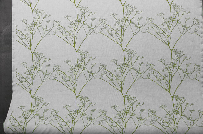 Natural Linen Fabric printed with Green floral print. Medium weight fabric.