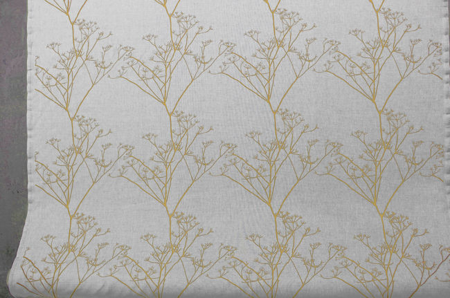 Natural Linen Fabric printed with Yellow floral print. Medium weight fabric.
