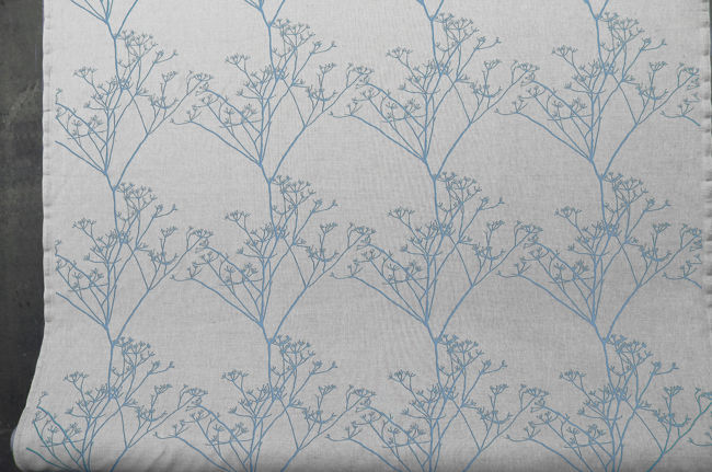 Natural Linen Fabric printed with Blue floral print. Medium weight fabric.