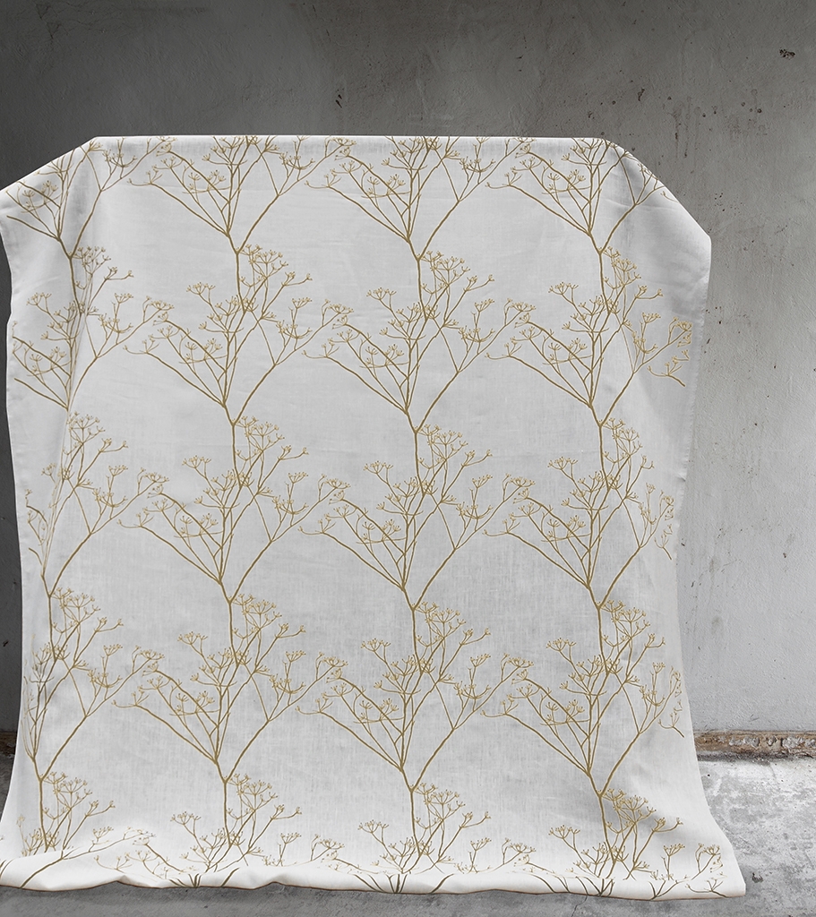 White 100% Linen fabric printed with Mustard Yellow floral print. Medium weight fabric.