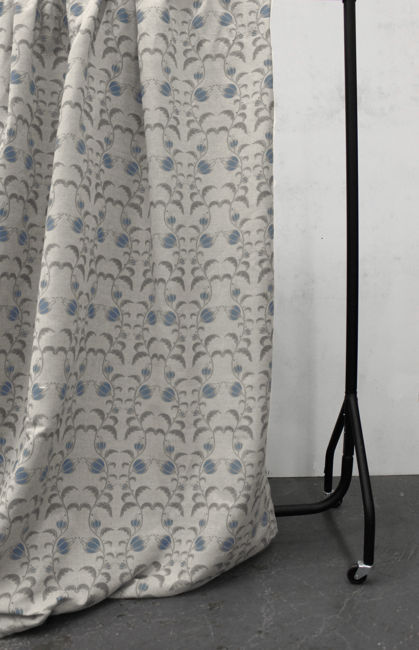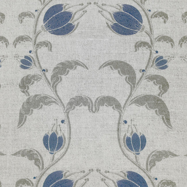 Natural Linen Fabric printed with Blue and Grey floral print. Medium weight fabric.