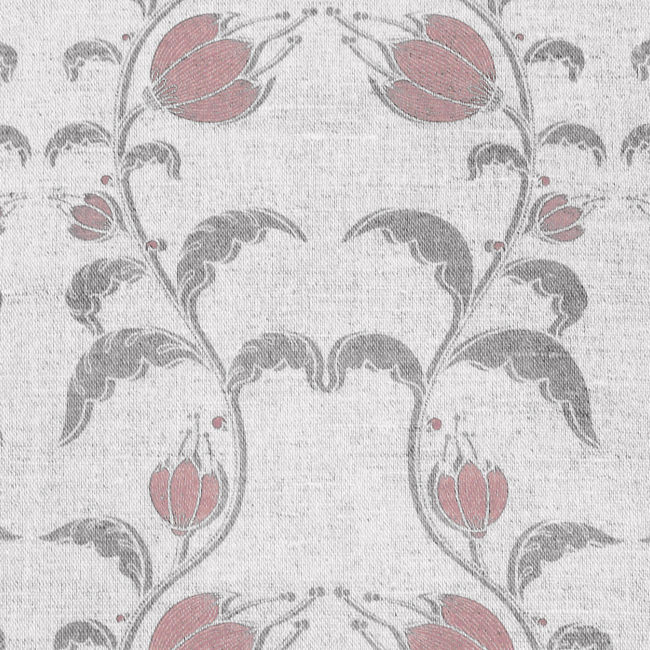 Natural Linen Fabric printed with Pink and Grey floral print. Medium weight fabric.