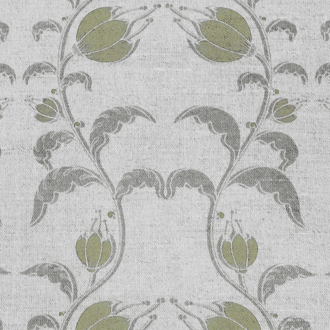 Natural Linen Fabric printed with Olive Green and Grey floral print. Medium weight fabric.