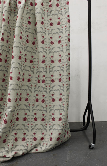 Natural Linen Fabric printed with Red and Grey floral print. Medium weight fabric.