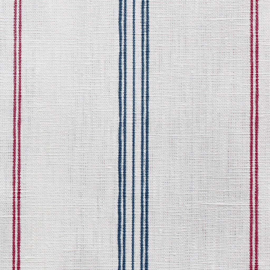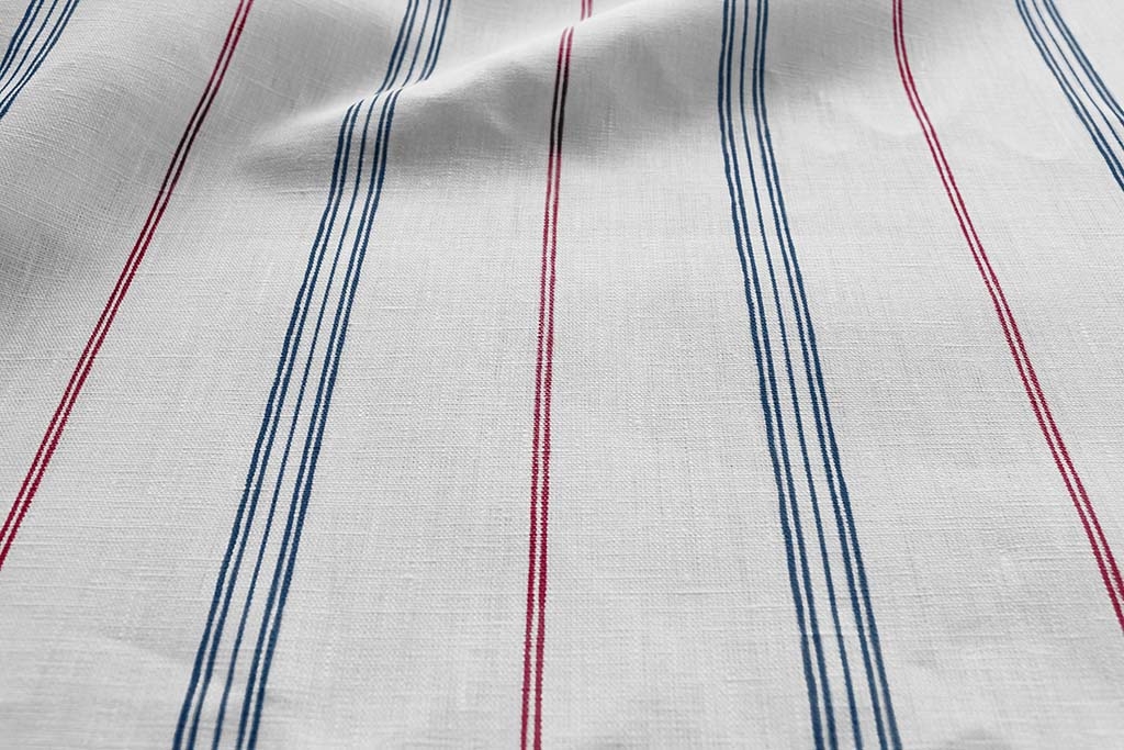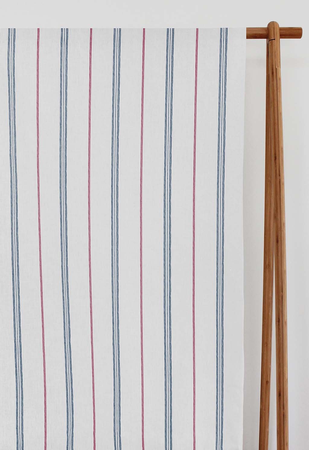 A striped white linen fabric with subtle coloured stripes. Medium weight fabric.
