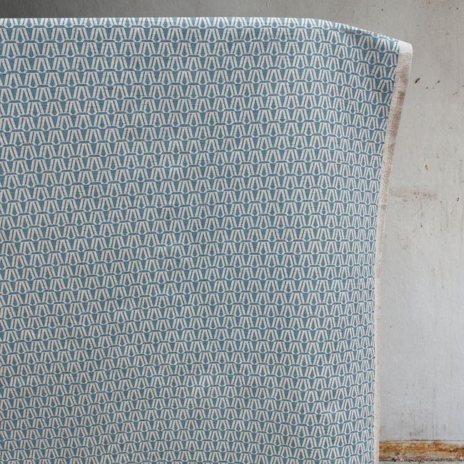 Blue contemporary print on Natural Linen fabric. Medium weight fabric.