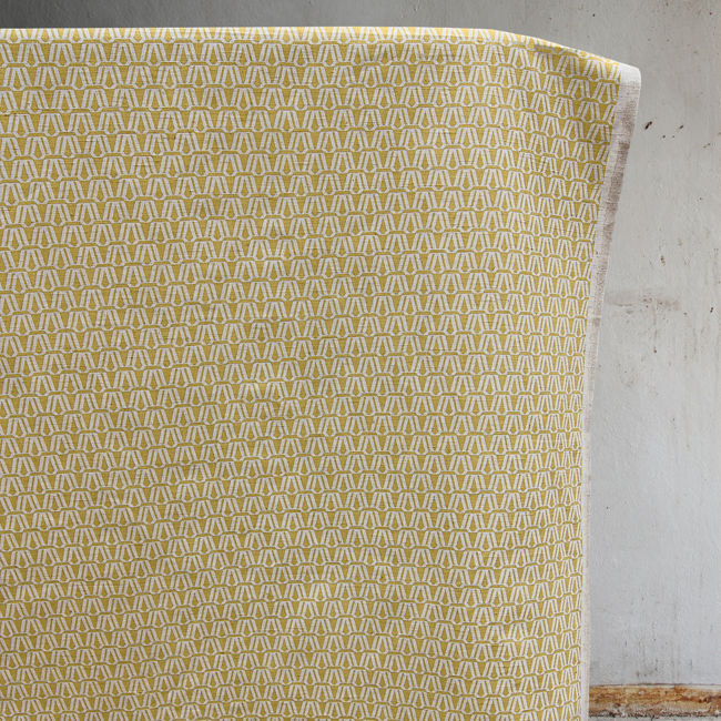 Mustard Yellow contemporary print on Natural Linen fabric. Medium weight fabric.