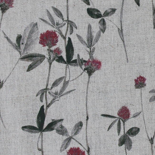 Natural Linen Fabric printed with Red and Grey floral print. Medium weight fabric.