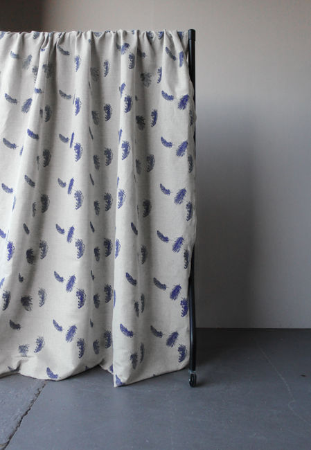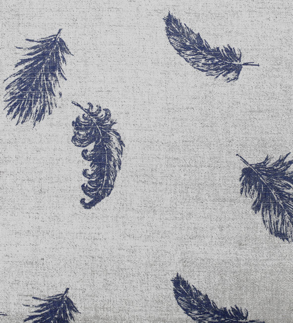 Natural Linen Fabric printed with Dark Blue feathers print. Medium weight fabric.
