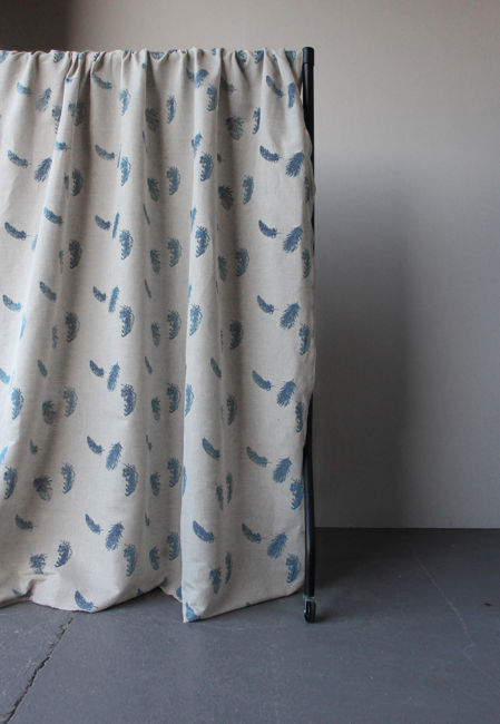 Natural Linen Fabric printed with Blue feathers print. Medium weight fabric.