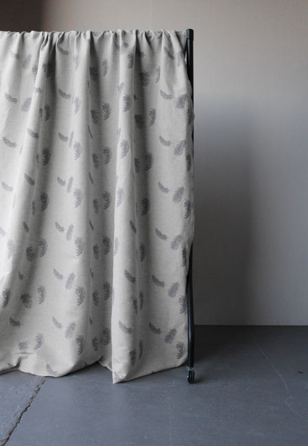 Natural Linen Fabric printed with Greige feathers print. Medium weight fabric.