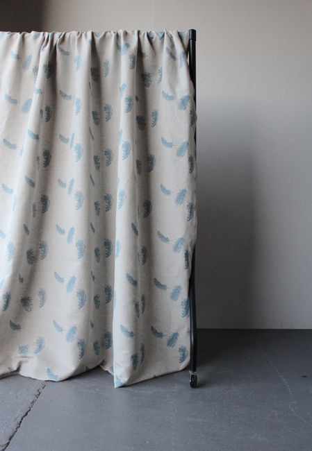 Natural Linen Fabric printed with Light Blue feathers print. Medium weight fabric.