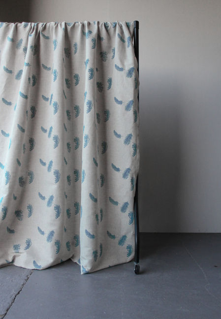 Natural Linen Fabric printed with Blue feathers print. Medium weight fabric.