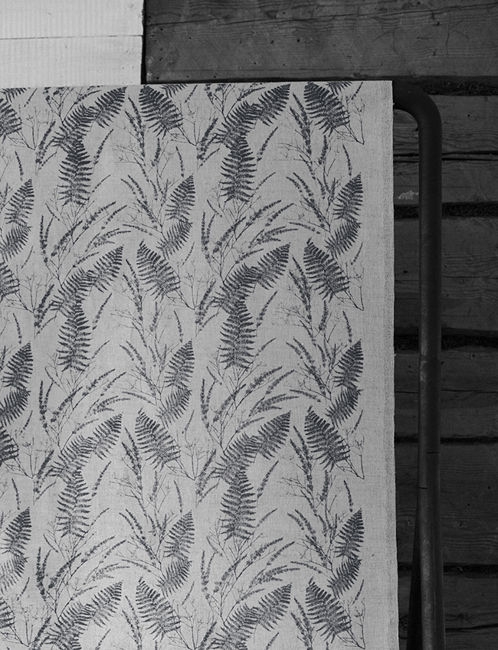 Natural Linen Fabric printed with Dark Grey botanical print. Medium weight fabric.