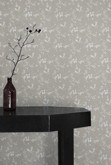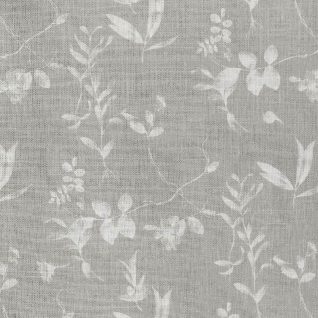 White Linen Fabric printed with Grey botanical print. Medium weight fabric.
