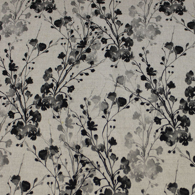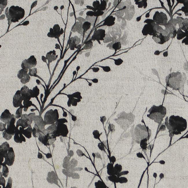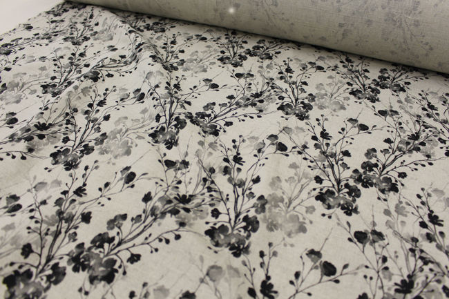 Natural Linen Fabric printed with black and grey floral print. Medium weight fabric.