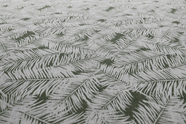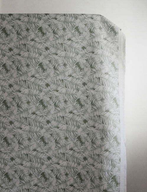 Gabi Khaki is a Natural Linen Cotton fabric with a Green botanical leaf pattern. Medium weight fabric.