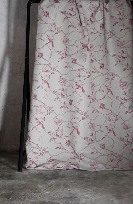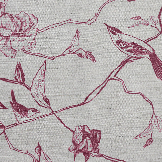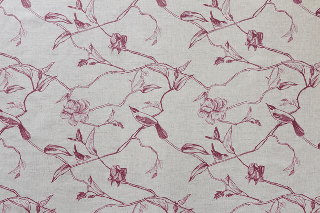 Gardenia Cherry is a linen mix fabric printed with Red botanical print, with birds. Medium weight fabric.