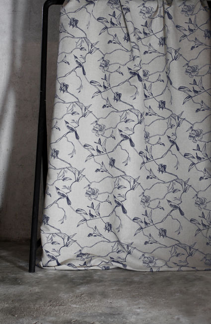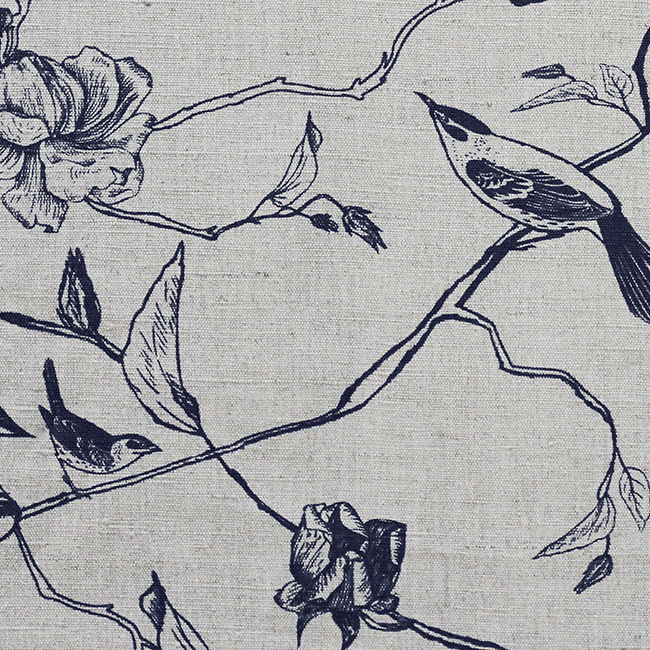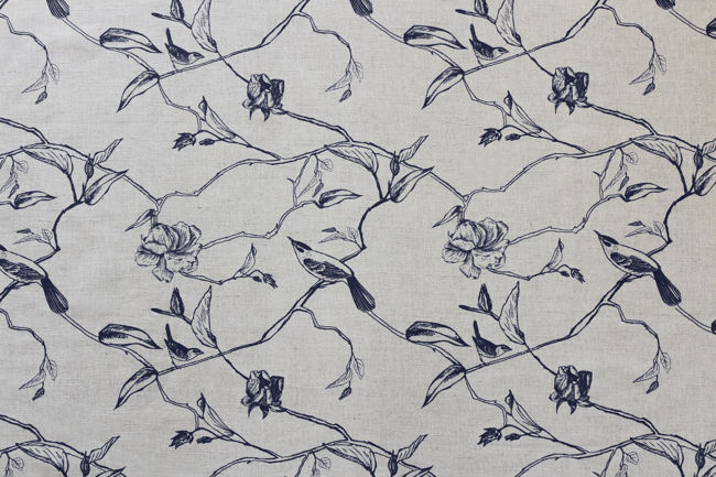 Gardenia Deep Blue is a linen mix fabric printed with Dark Blue botanical print, with birds. Medium weight fabric.