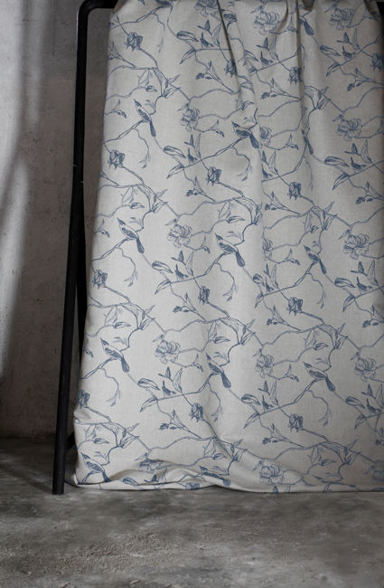 Gardenia Denim is a linen mix fabric printed with Blue botanical print, with birds. Medium weight fabric.