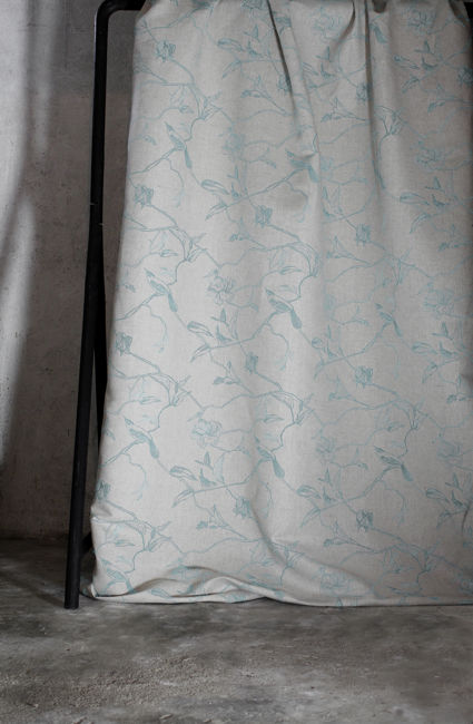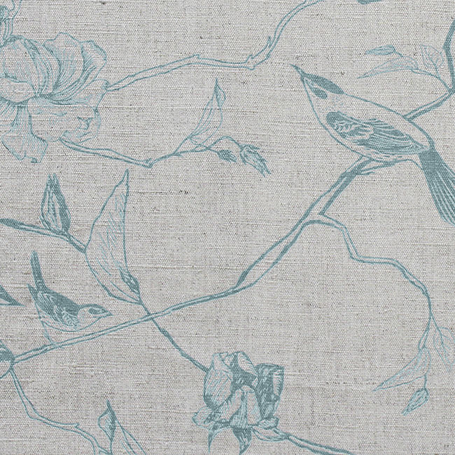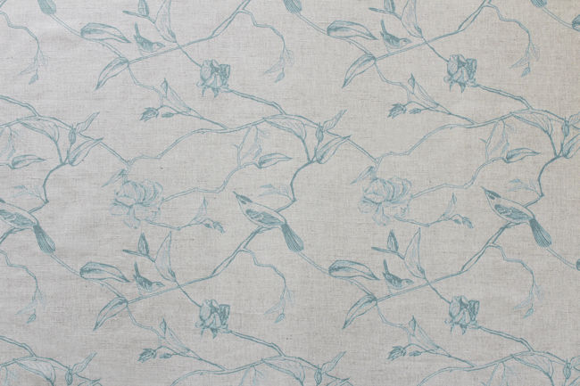Gardenia Duck Egg is a linen mix fabric printed with light Blue botanical print, with birds. Medium weight fabric.