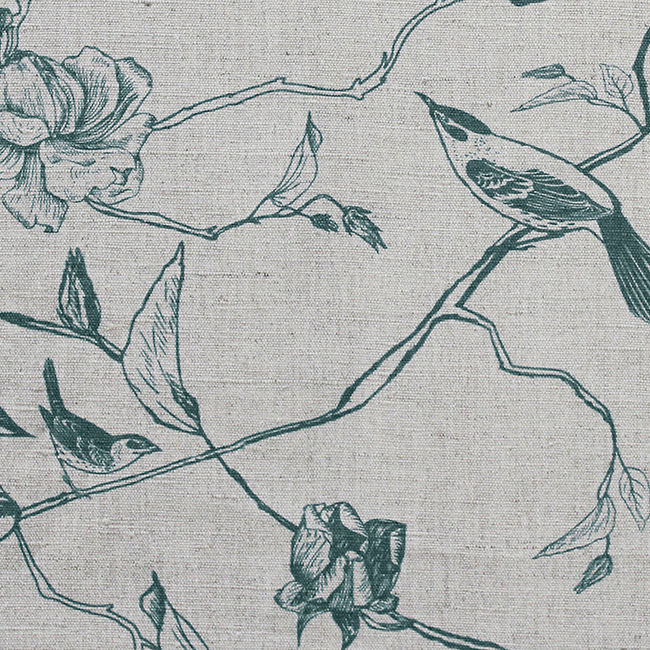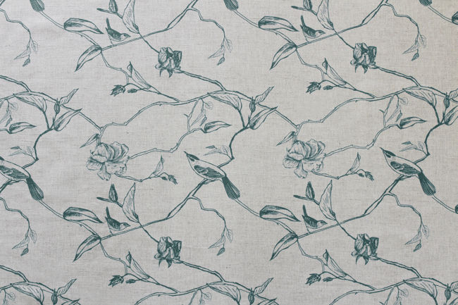 Gardenia Fern is a linen mix fabric printed with Green botanical print, with birds. Medium weight fabric.