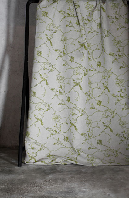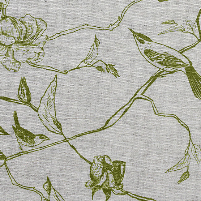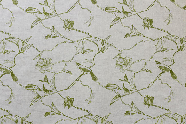 Gardenia Leaf is a linen mix fabric printed with Green botanical print, with birds. Medium weight fabric.