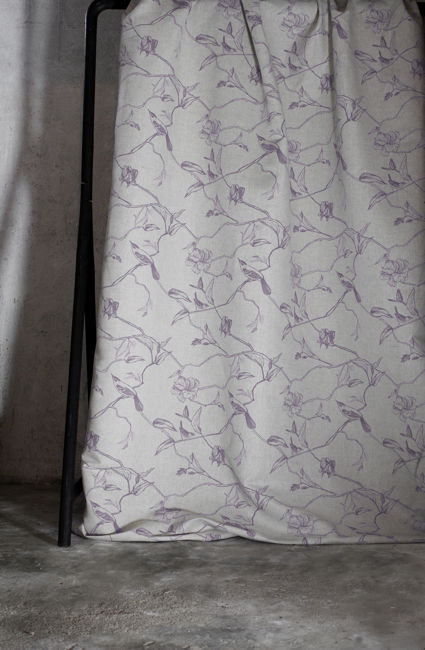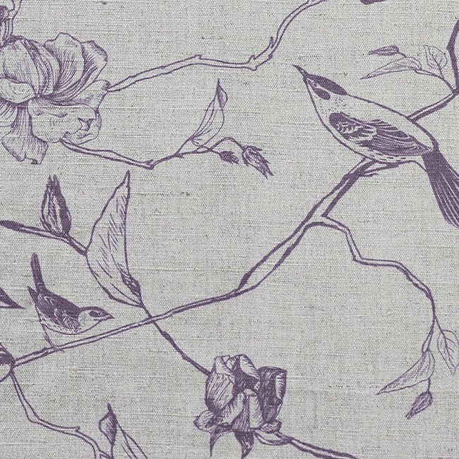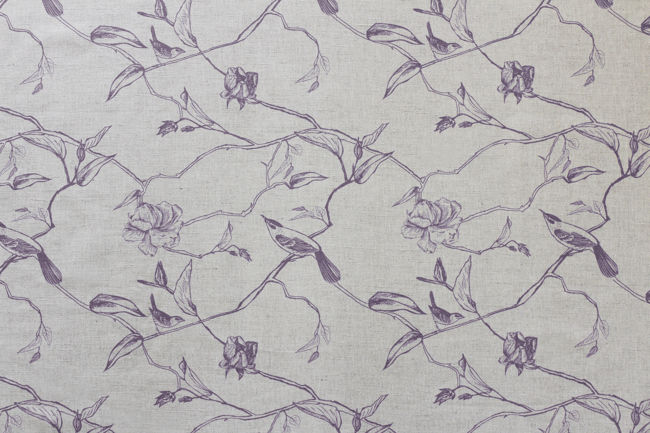 Gardenia Powder Plum is a linen mix fabric printed with pale Purple botanical print, with birds. Medium weight fabric.