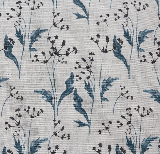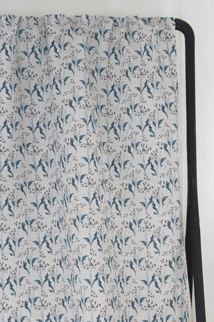 Natural Linen Fabric printed with Blue and Black floral print. Medium weight fabric.