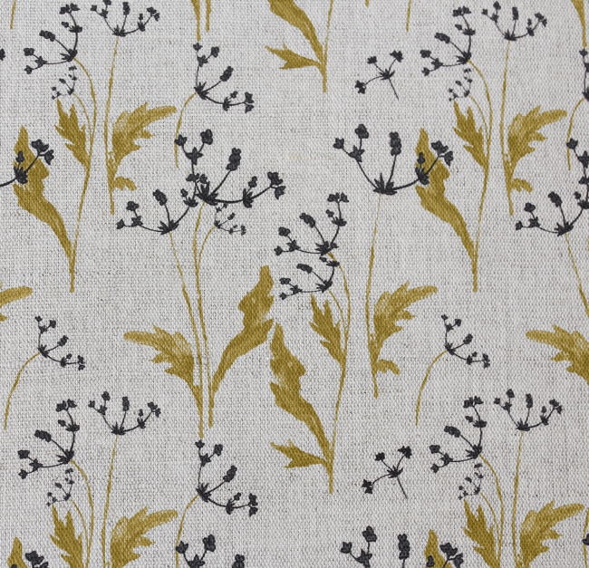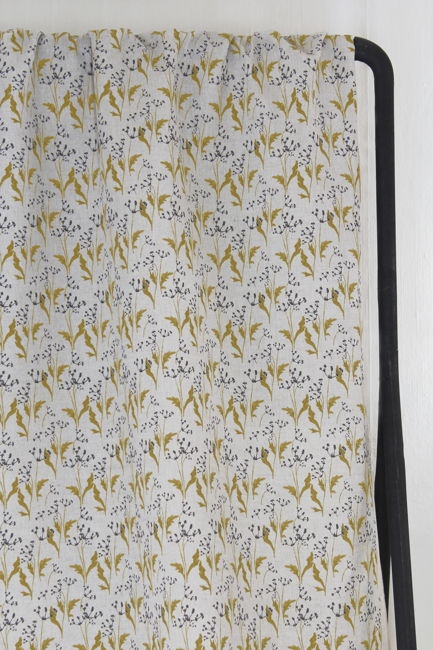 Natural Linen Fabric printed with Yellow and Black floral print. Medium weight fabric.