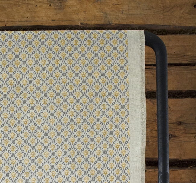 Hilla Mustard Greige is a Natural Linen Cotton fabric with an abstract two-coloured Yellow and Grey pattern. Medium weight fabric.