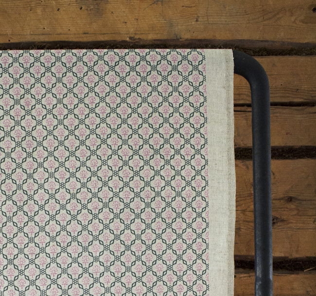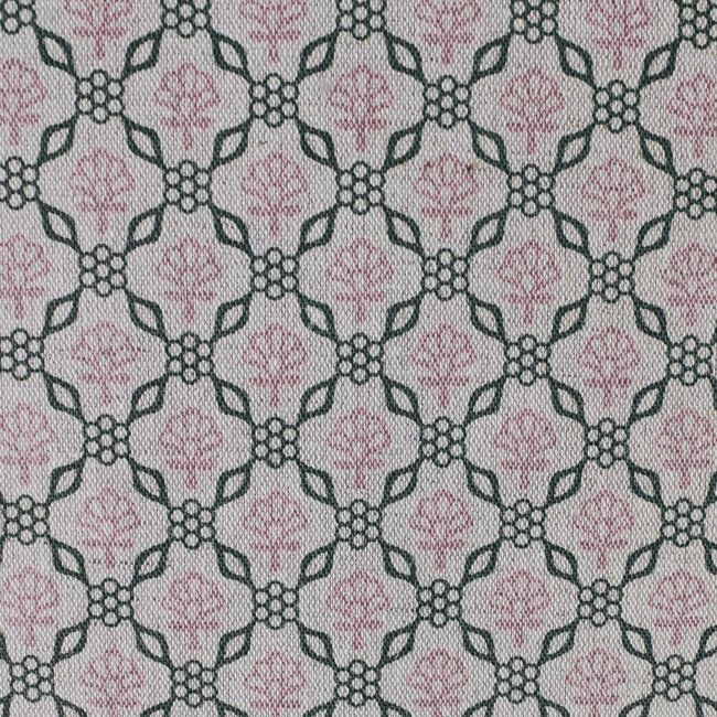 Hilla Pink Pine is a Natural Linen Cotton fabric with an abstract two-coloured Pink and dark Green pattern. Medium weight fabric.