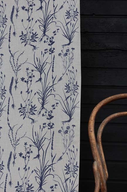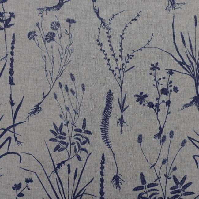 Natural Linen Cotton fabric printed with Blue . Medium weight fabric.