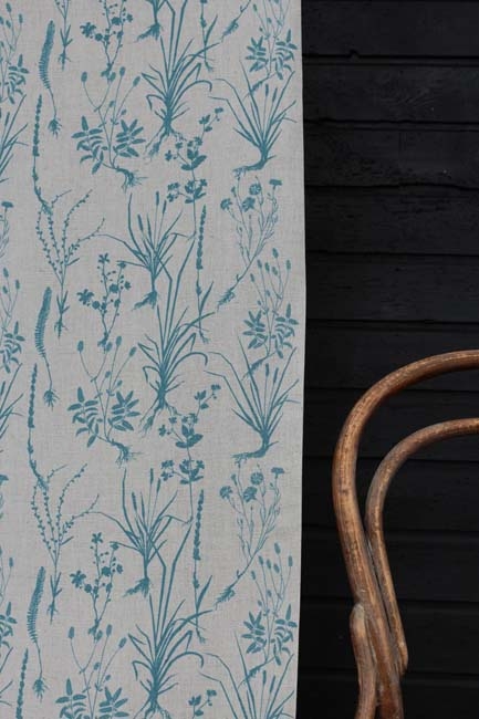 Natural Linen Cotton fabric printed with Blue . Medium weight fabric.