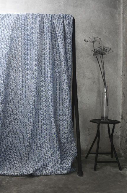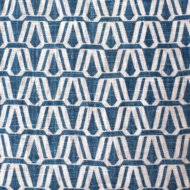 Blue contemporary print on White 100% Linen fabric. Medium weight fabric.