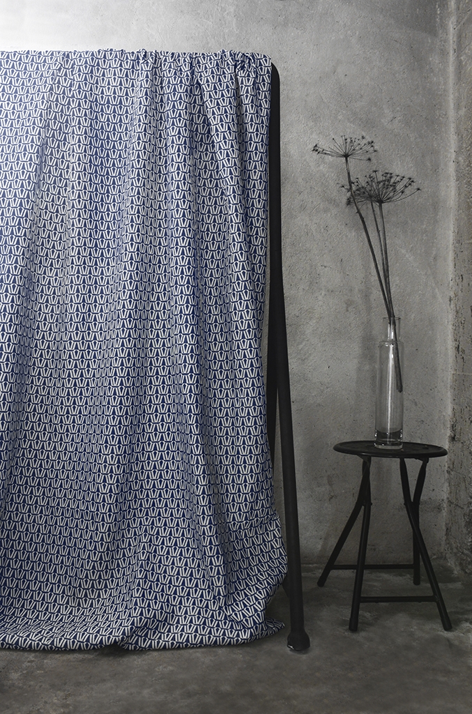 Blue contemporary print on White 100% Linen fabric. Medium weight fabric.