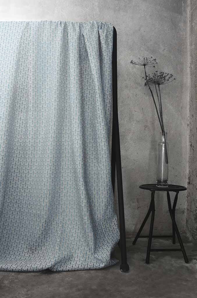 Blue contemporary print on White 100% Linen fabric. Medium weight fabric.