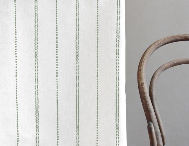 Inga Meadow is a white 100% Linen fabric with Green decorative stripes. Medium weight fabric.